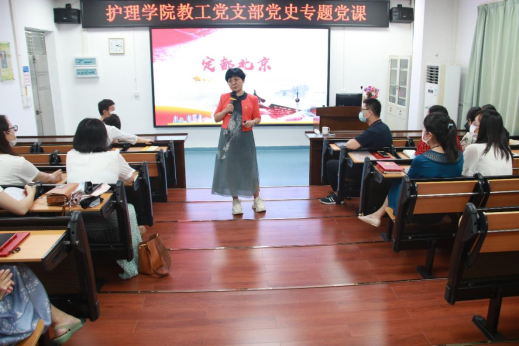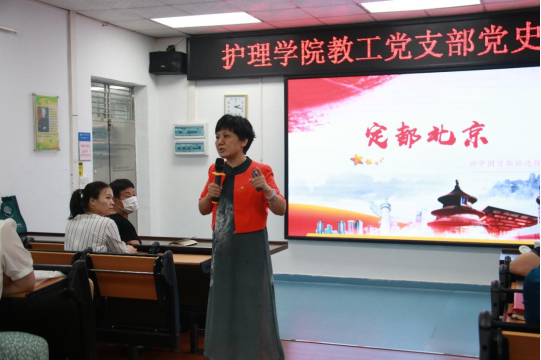 9月17日,护理学院教工党支部举行党史专题党课学习,党支部书记王秀岚教授以《定都北京——新中国首都的选择》为主题开讲专题党课。护理学院全体教工党员参会学习。