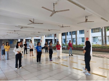 活动现场,周心怡带领在场师生进行热身活动,使身体可以得到充分的拉伸、舒展。为把每一个动作都做到细致专业,周心怡通过亲身示范,纠正学员错误动作,一遍遍向师生们讲解动作的细节以及注意事项。