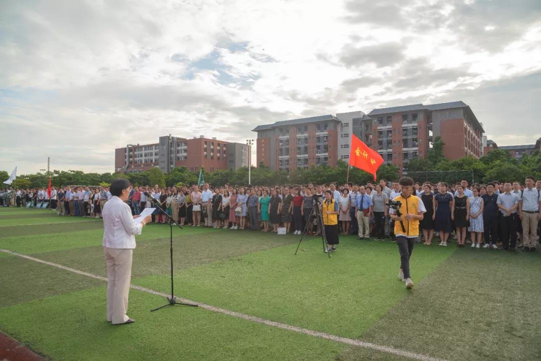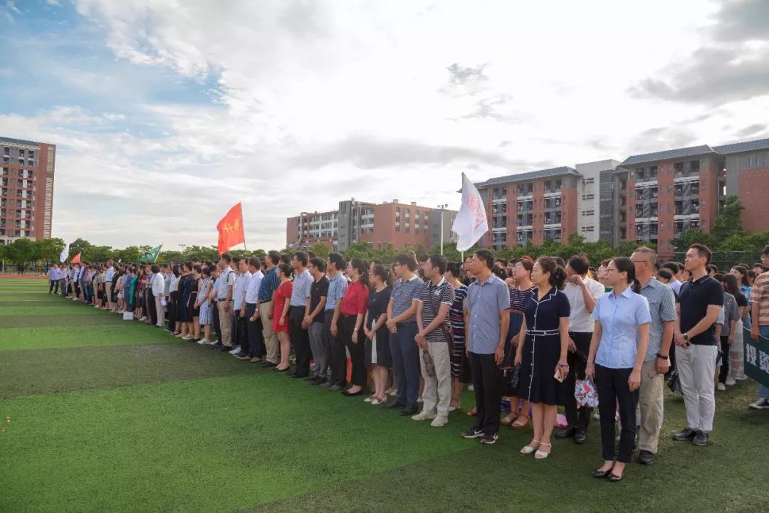中华人民共和国成立70周年华诞到来之际,为进一步加强中山大学新华学院(以下简称“我校”)师生对中国特色社会主义道路自信、理论自信、制度自信、文化自信,着力培养新时代有信仰、有力量的德智体美劳全面发展的社会主义事业建设者和接班人,9月2日,我校在东莞校区体育场举行了庄严肃穆的升国旗仪式,中大新华师生同上“开学第一课”——“我为祖国升国旗”主题的“爱国主义教育课”。我校领导、院系负责人、职能部门负责人、老师和同学们参加活动。党委副书记、副校长蓝永金同志主持升旗仪式。