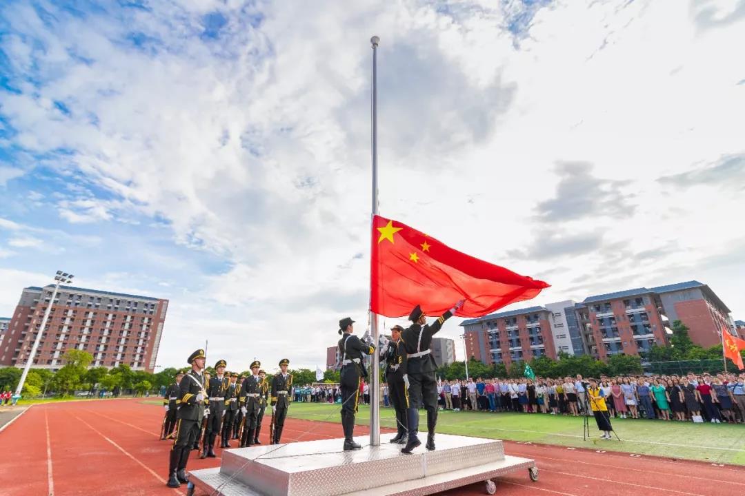 我校党委书记周云同志在鲜艳的五星红旗下发表了重要讲话。她对全体师生致以新学期的问候。她讲到,再过28天,我们就将迎来中华人民共和国成立70周年华诞,举国上下洋溢着浓浓的爱国情怀。我们在新学期第一天这里隆重集会,举行升国旗仪式,神圣而有意义。习近平总书记在纪念五四运动100周年大会上把“爱国主义”作为一条鲜明主线贯穿全篇,科学回答了新时代青年“为什么要爱国、怎样才是爱国、如何去爱国”的根本问题,明确强调了爱国主义之于新时代青年的时代价值,鲜明指出了新时代青年践行爱国主义的实践要求。