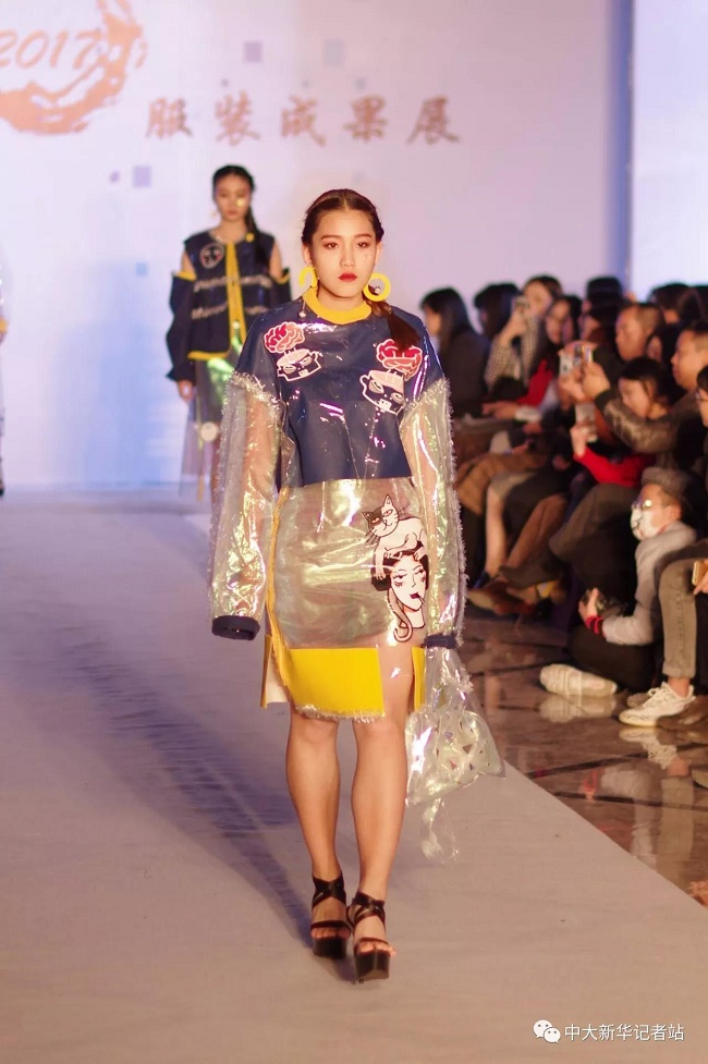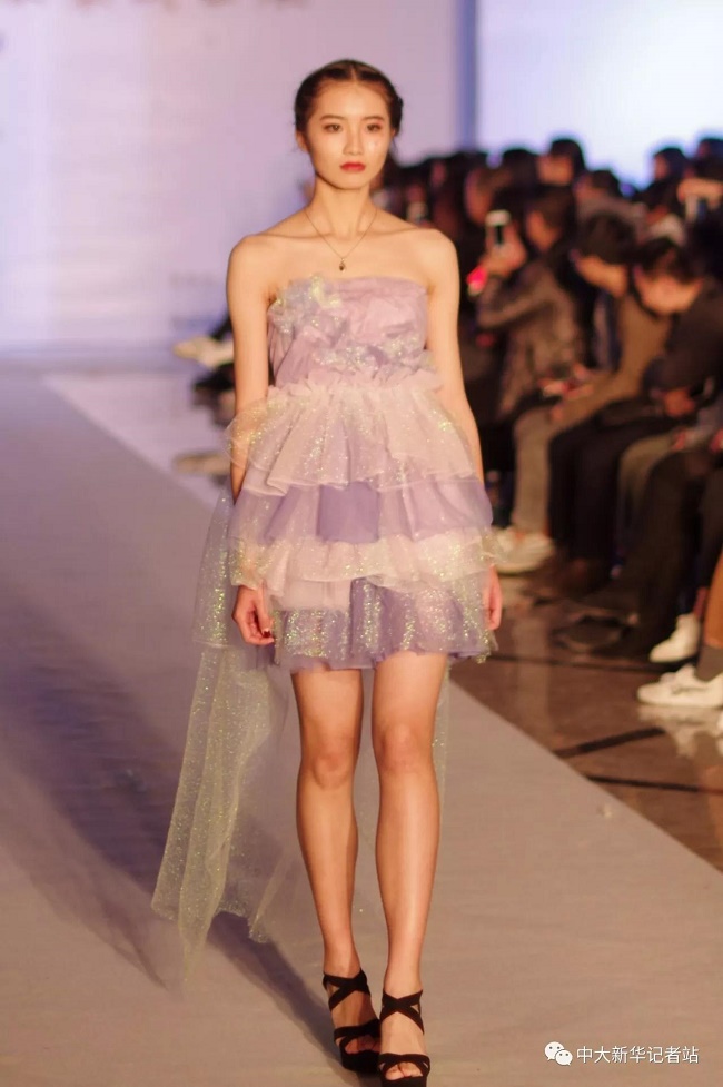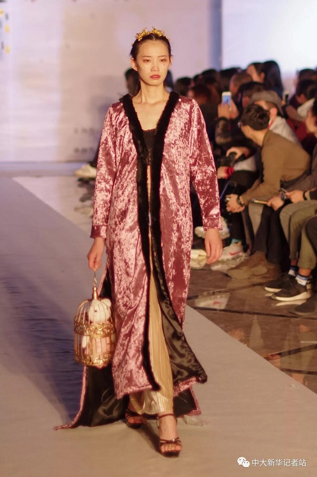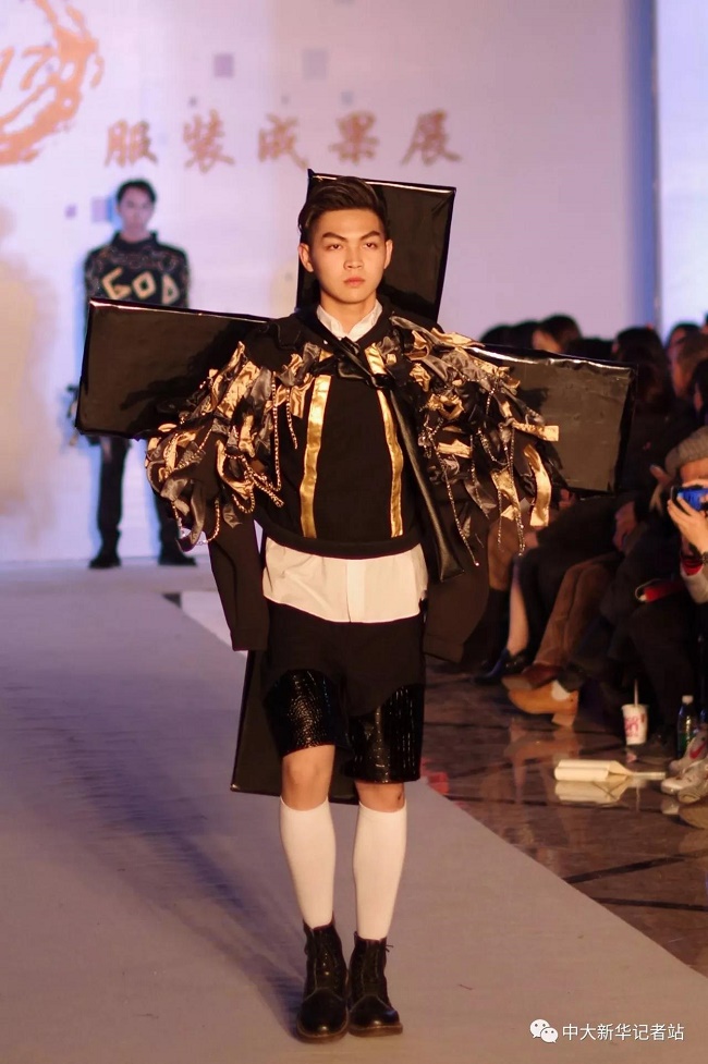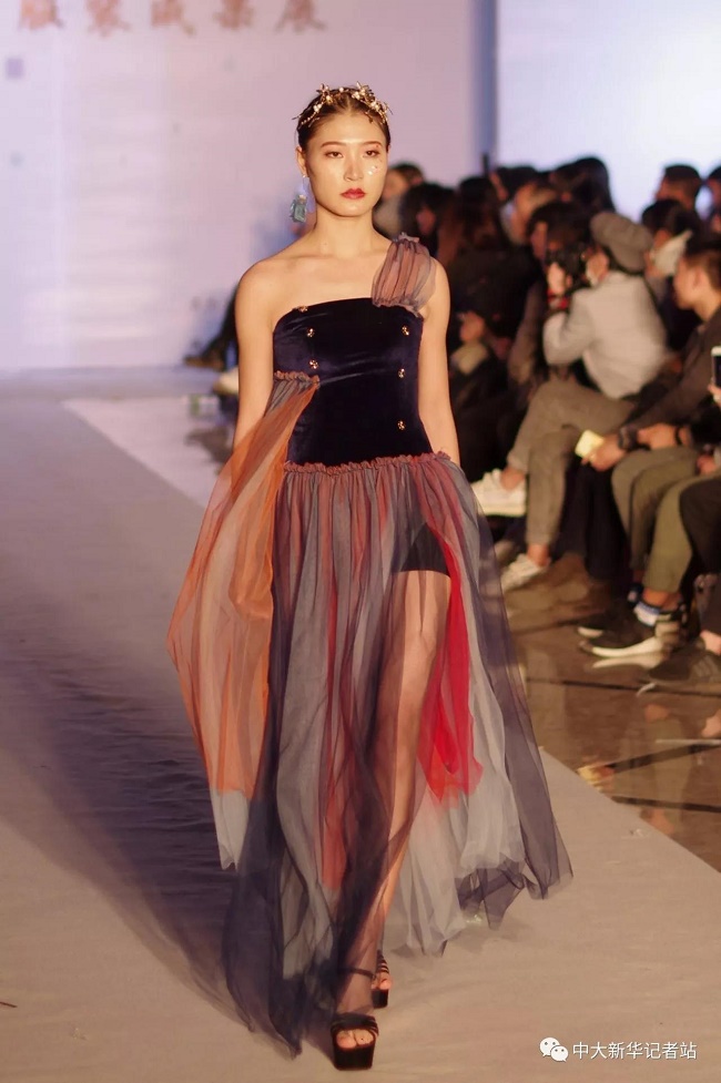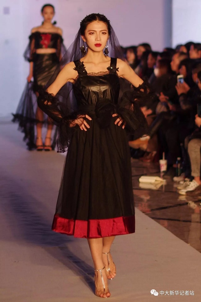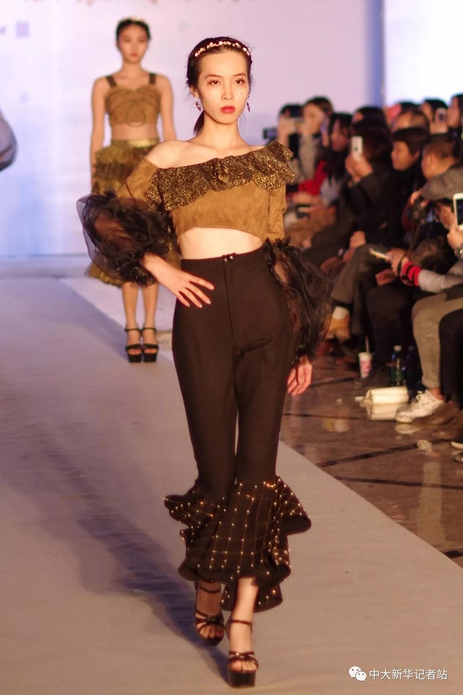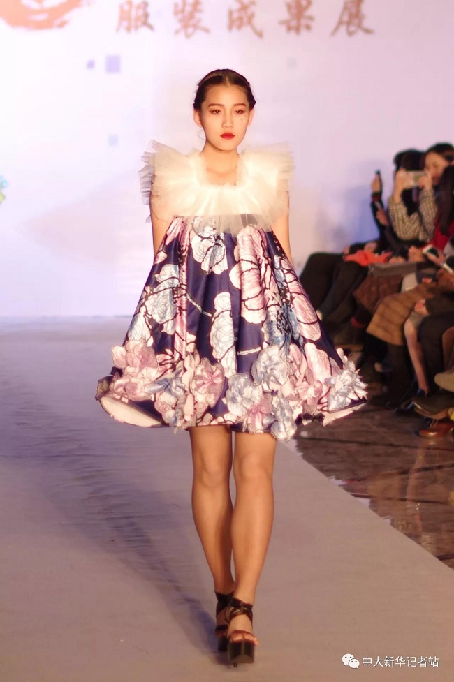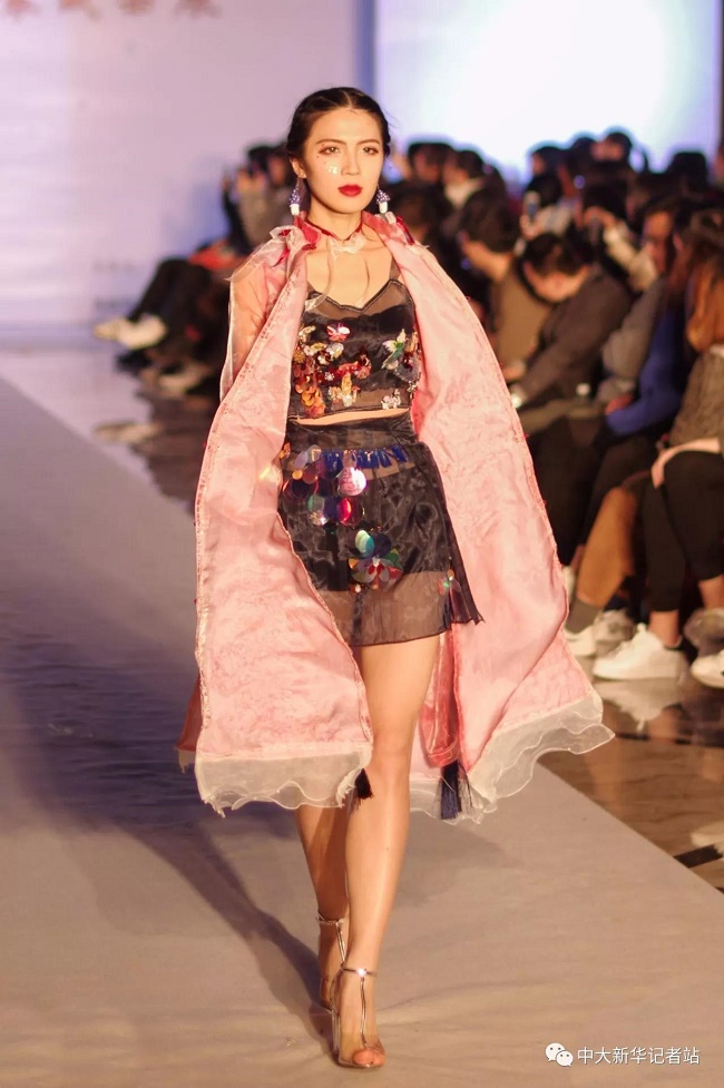 12月20日晚,由中山大学新华学院艺术与传媒学院主办,中山大学新华学院服装协会承办的2017服饰采风成果展在龙湖大酒店盛大举行。本次出展的服装,由学生自行创作设计。置身偌大的舞台,学生模特们穿戴精致的服装,配以精致的妆容,在灯光的渲染下,携带着自信走来。58名设计师所设计的27个系列的服饰个性鲜明、剪裁独特、独具匠心。