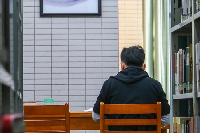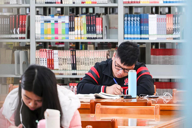 一排排整齐高大的书架放着密密麻麻的书籍,同学们准时来到这里,安静入座,陆陆续续拿起书本默默捧读,还时不时地拿起黑色钢笔在笔记本上做记录。