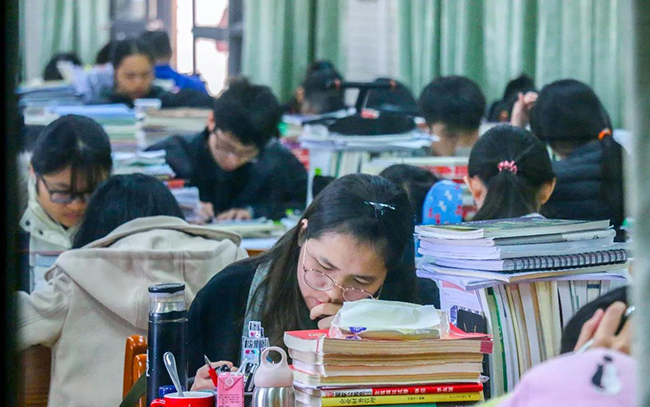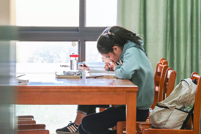 书山书海的自习室,安静得连天花板灯管的电流声都清晰可辨,同学们在纸上认真地演算、书写——那是有关青春的记录,也是有关奋斗的痕迹。