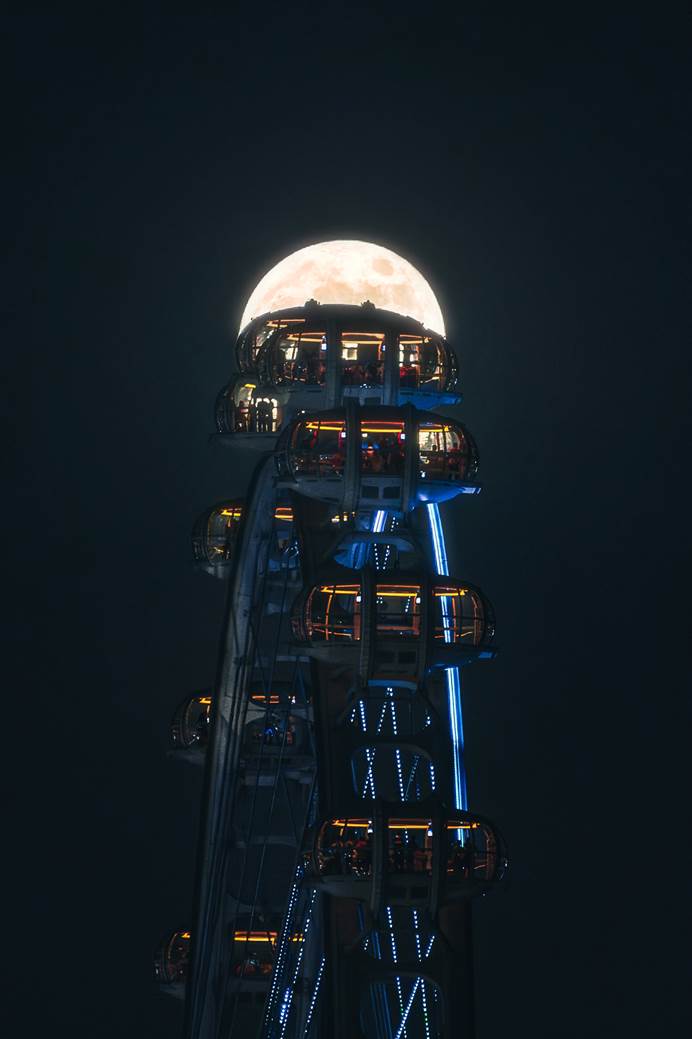 事件内容:一轮皎洁的明月静静地悬挂在如墨的夜空中,洒下银白的光辉,那巨大的摩天轮静静地矗立在湖水中央,在明月的映照下,闪烁着神秘而柔和的光芒。摩天轮的轿厢里,一家人紧紧依偎在一起。孩子们趴在窗户边,眼睛里满是惊喜,望着窗外那轮又大又圆的月亮和被月光染成银色的湖水。大人们则轻声交谈着,脸上洋溢着幸福的笑容。他们分享着生活中的点滴温暖,回忆着往昔的美好时光。随着摩天轮缓缓转动,每一个轿厢都仿佛是一个小小的团圆世界,承载着满满的亲情。从远处望去,摩天轮与月亮相互映衬,构成了一幅如梦如幻的美丽画卷。