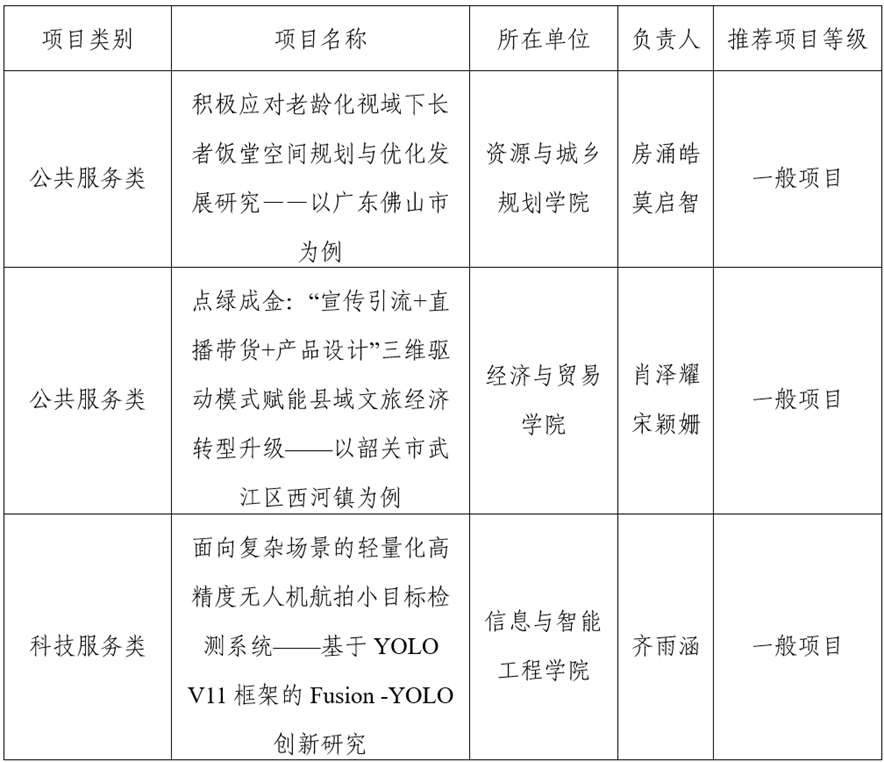 为深入学习贯彻党的二十届四中全会精神,明确中华人民共和国国民经济和社会发展第十五个五年规划纲要,积极响应新时代对高素质人才的迫切需求,进一步培育青年大学生的团队协作精神和科研创新思维,根据《关于开展2026年度广东省科技创新战略专项资金(大学生科技创新培育)项目申报的通知》的有关要求,校团委组织开展2026年广东省科技创新战略专项资金(大学生科技创新培育)项目申报工作,我校推荐3个一般项目申报省级立项。前期,经团队项目申报、资格审查工作小组审查核实、项目答辩等环节,经综合评定,推选《积极应对老龄化视域下长者饭堂空间规划与优化发展研究》等3个项目为“一般项目”,推荐省级立项。现予以公示。