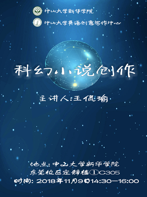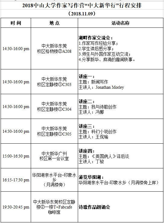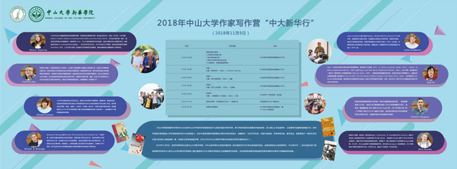 2018年11月9日,该写作营将再次走进中山大学新华学院,与中大新华师生文学创作爱好者一起开展系列文化文学交流和教学活动,这是该营创办以来的第四次“中大新华行”。此行由国内首个英语创意写作研究中心和中山大学作家写作营创始人戴凡教授同中山大学新华学院校长王庭槐教授共同组织,旨在探索英语教学的新途径和推动创意写作教学与创意教育的发展。