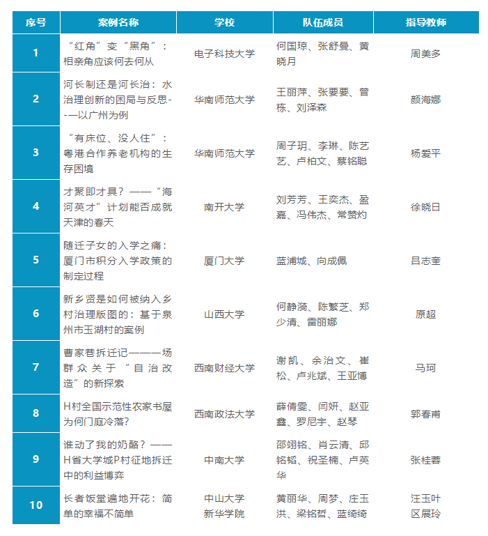 本届大赛于2018年5月正式启动,经过初赛的激烈争夺,10支精英队伍脱颖而出,进入最终总决赛。届时,来自广东省行政管理学会的专家及中山大学、中南大学、华南师范大学、贵州大学、电子科技大学的教授们将进行专业评审。学术盛宴,不容错过!