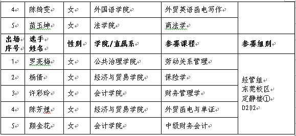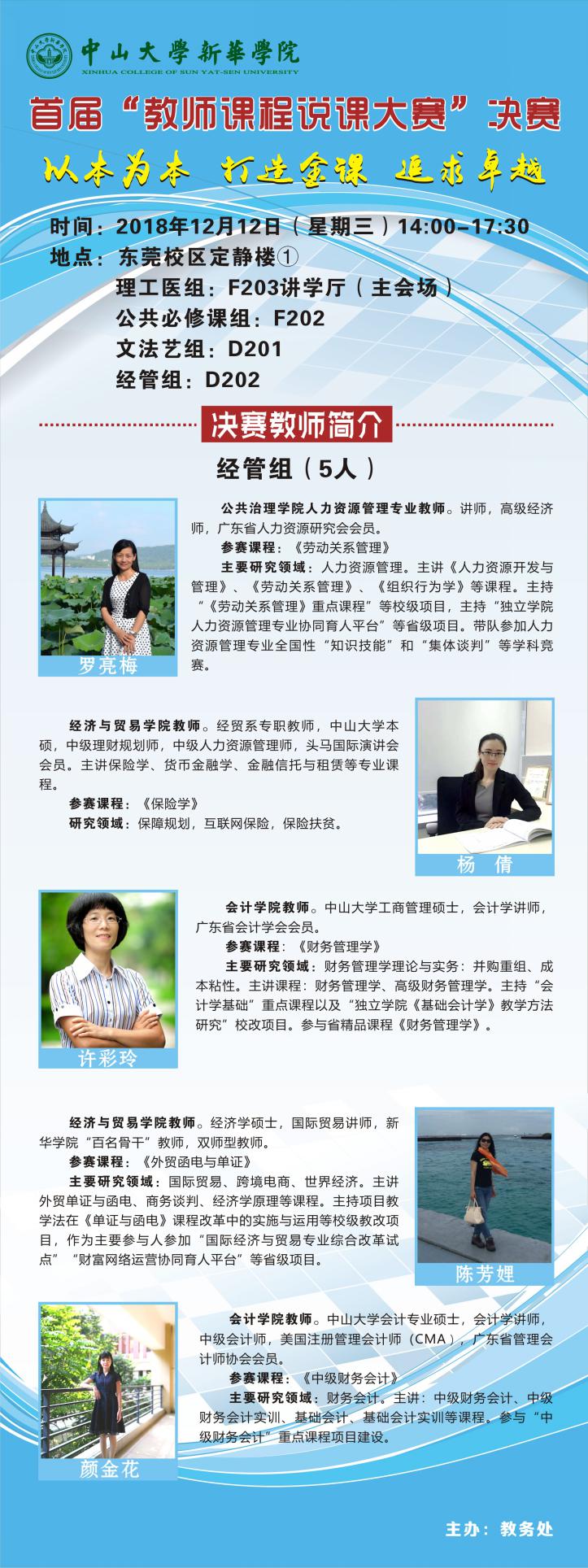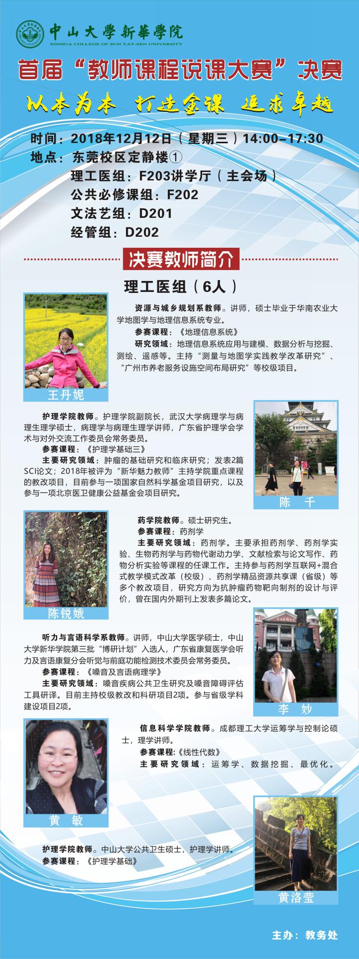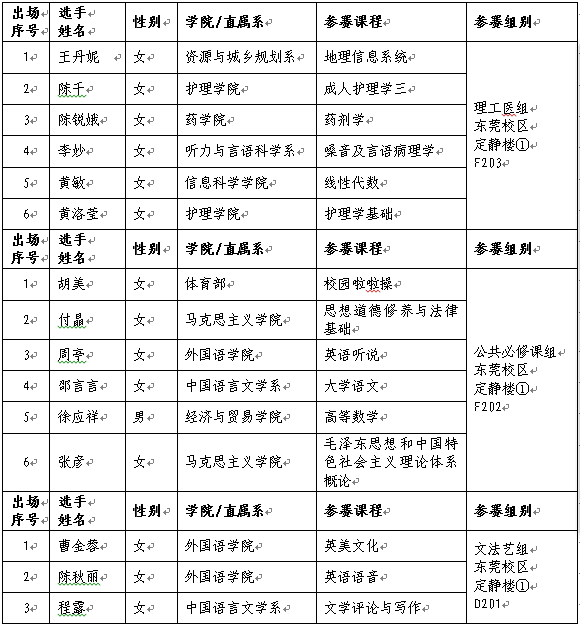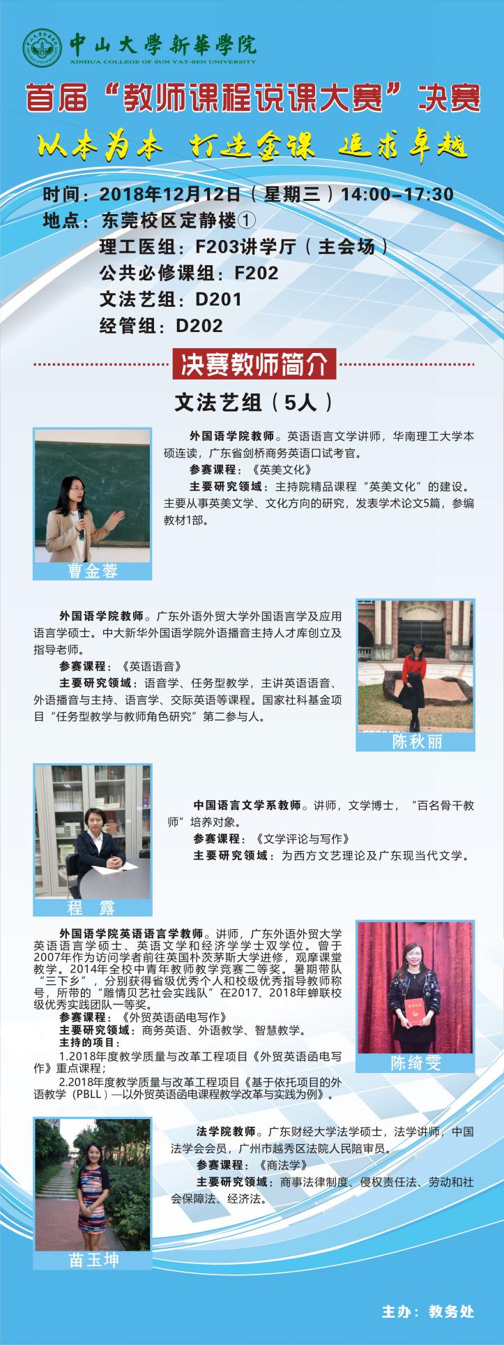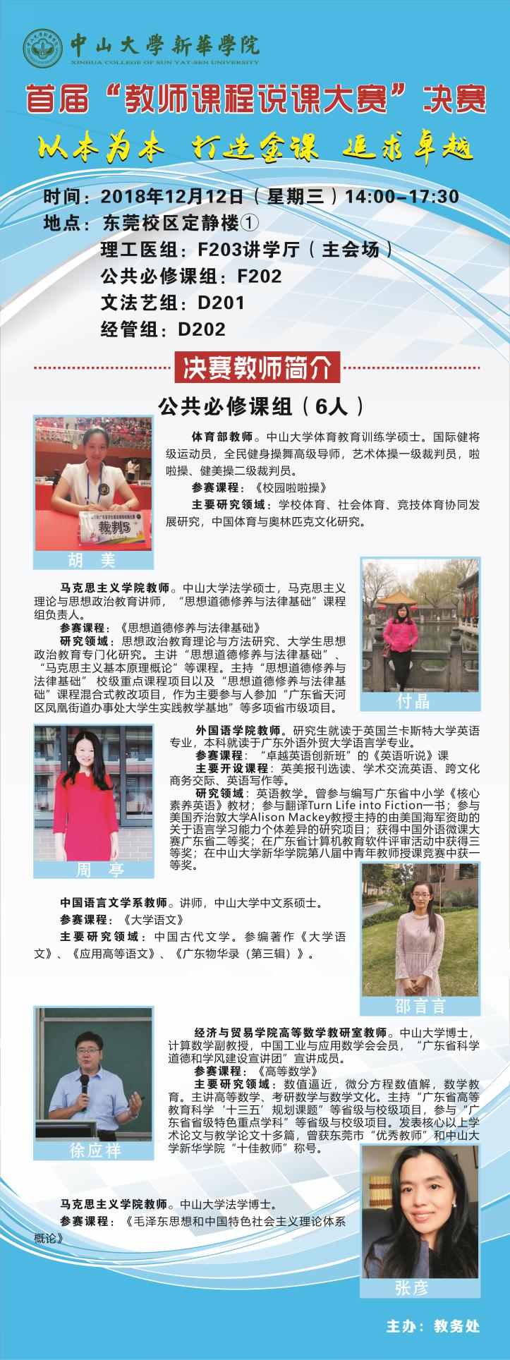 决赛于12月12日14:00-17:30在东莞校区定静楼①举行。本次比赛分为理工医组(F203)、公共必修课组(F202)、文法艺组(D201)与经管组(D202)四组同时进行,各自评比角逐。让我们拭目以待各位教师展现教学风采、师者魅力。