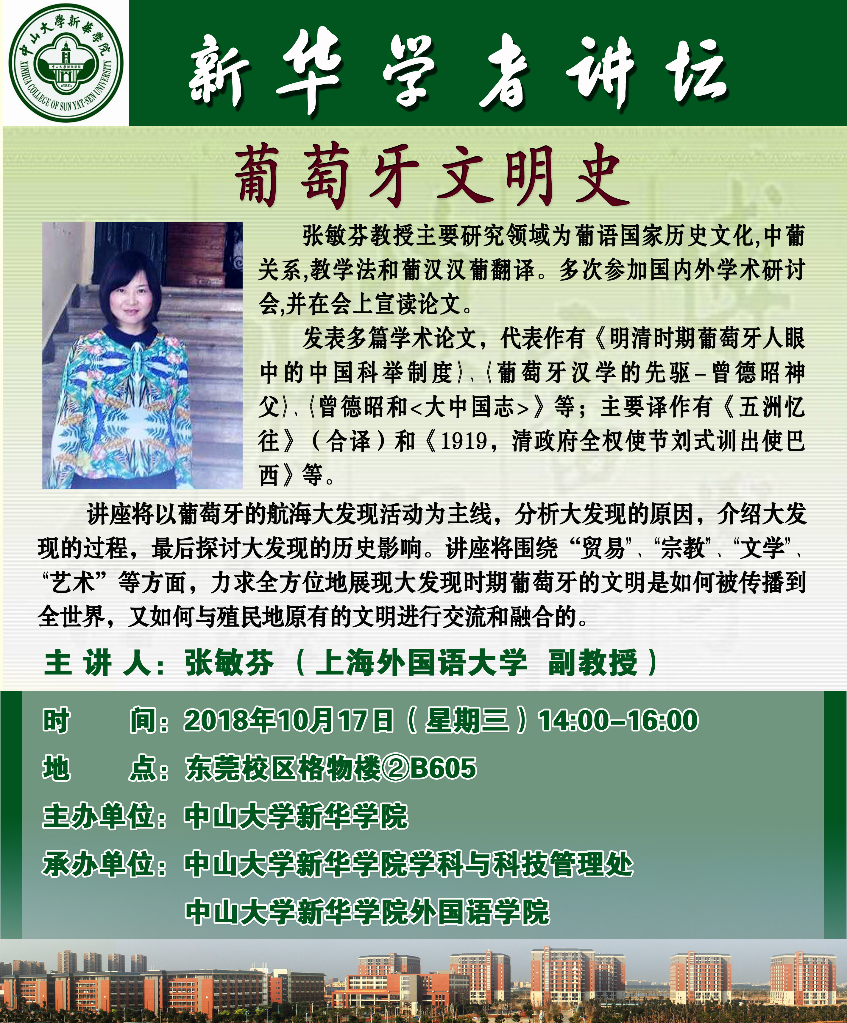 讲座将以葡萄牙的航海大发现活动为主线,分析大发现的原因,介绍大发现的过程,最后探讨大发现的历史影响。讲座将围绕“贸易”、“宗教”、“文学”、“艺术”等方面,力求全方位地展现大发现时期葡萄牙的文明是如何被传播到全世界,又如何与殖民地原有的文明进行交流和融合的。
