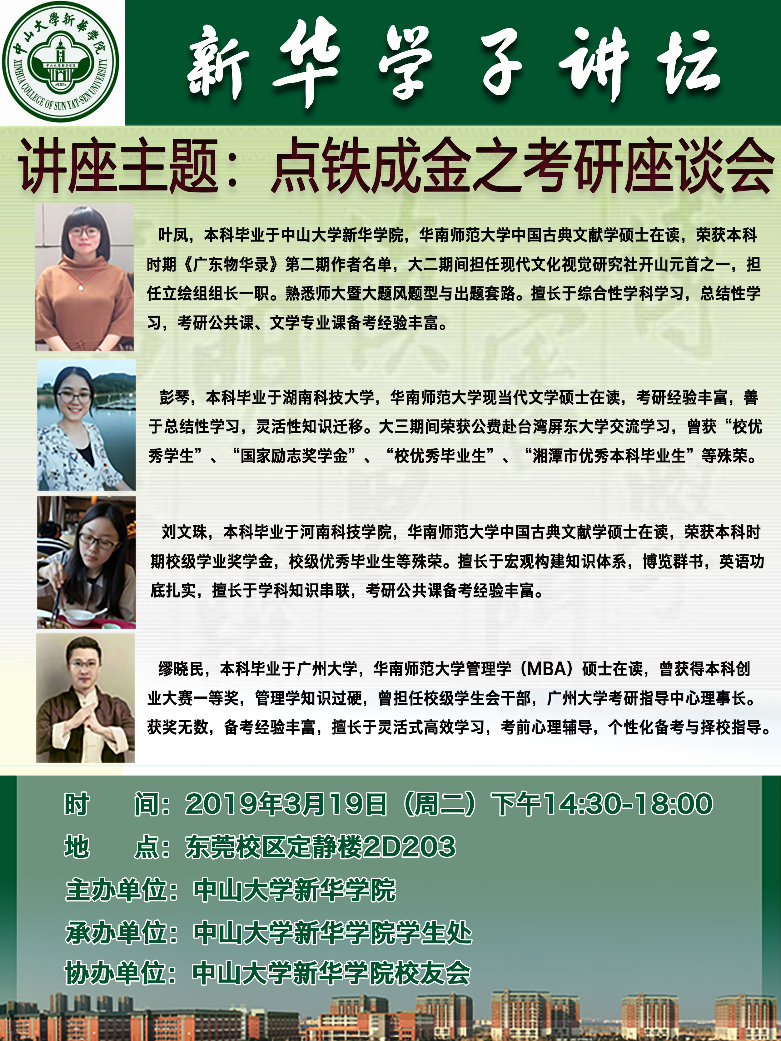 校友通过分享自身的考研经验和学习方法,为在考研路上学生们正面临的以及将来可能会遇到的问题,提供解决建议,同时解答疑惑,为新华学院有兴趣或正在准备考研的同学们加油鼓励,让更多的同学可以结合校友经验和自身的学习方法,更科学地展开学习,增强考研的信心和动力。