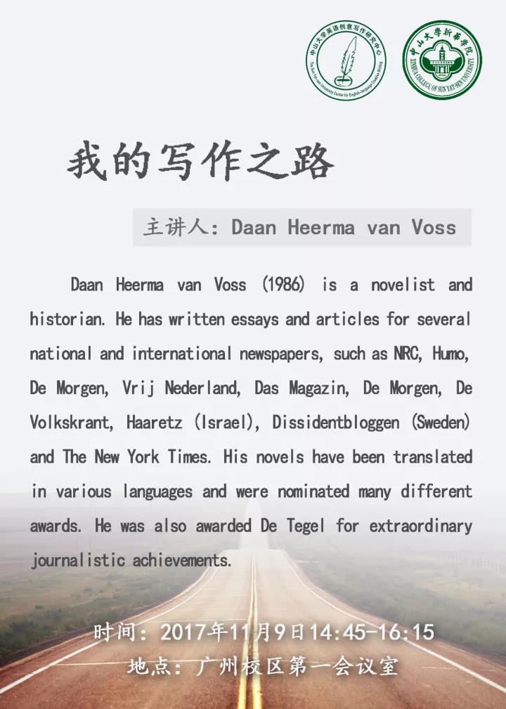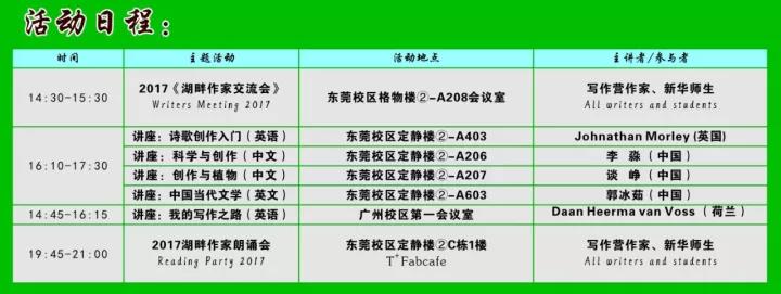 11月9日,该写作营将走进中山大学新华学院,与中大新华师生文学创作爱好者一起开展系列文化文学交流和教学活动。中山大学作家写作营“中大新华行”系列活动由国内首个英语创意写作研究中心和中山大学作家写作营的创始人戴凡教授同中山大学新华学院校长王庭槐教授共同组织,旨在探索英语教学的新途径和推动创意写作教学与创意教育的发展。