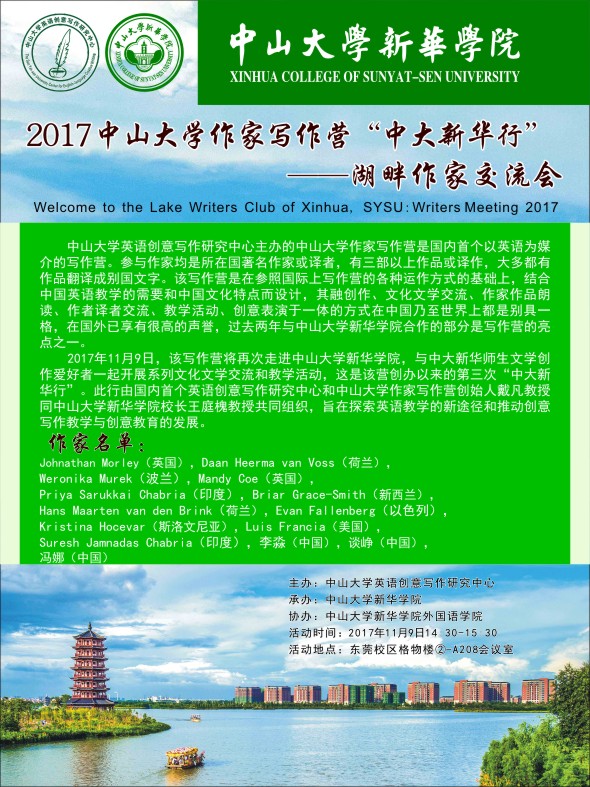 2017年11月9日,该写作营将再次走进中山大学新华学院,与中大新华师生文学创作爱好者一起开展系列文化文学交流和教学活动,这是该营创办以来的第三次“中大新华行”。此行由国内首个英语创意写作研究中心和中山大学作家写作营创始人戴凡教授同中山大学新华学院校长王庭槐教授共同组织,旨在探索英语教学的新途径和推动创意写作教学与创意教育的发展。