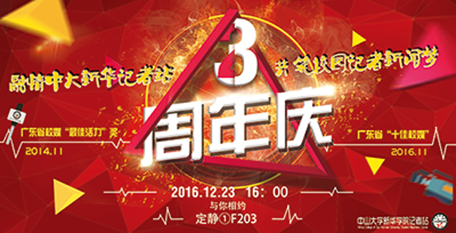 中山大学新华学院记者站成立三年来,每一步的成长都离不开您的支持与指导。中大新华记者站将于2016年12月23日下午16:00在东莞校区定静楼(教学楼)➀F203举行“中大新华记者站成立三周年暨第二届校园记者节”活动,诚邀您亲临指导。