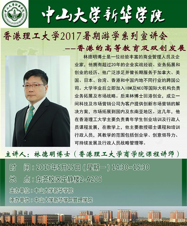 讲座主题:香港理工大学2017暑期游学系列宣讲会——香港的高等教育及双创发展