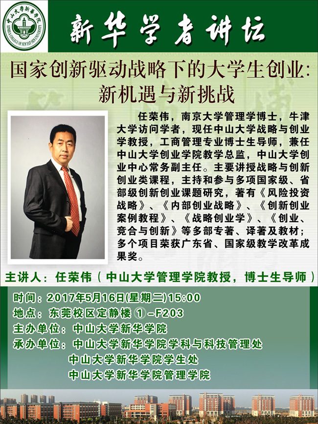 主讲嘉宾简介:任荣伟,中山大学管理学院教授、博士生导师,南京大学管理学博士,牛津大学访问学者,现任中山大学战略与创业学教授,工商管理专业博士生导师,兼任中山大学创业学院教学总监,中山大学创业中心常务副主任。主要讲授战略与创新创业类课程,主持和参与多项国家级、省部级创新创业课题研究,著有《风险投资战略》、《内部创业战略》、《创新创业案例教程》、《战略创业学》、《创业、竞合与创新》等多部专著、译著及教材;多个项目荣获广东省、国家级教学改革成果奖。