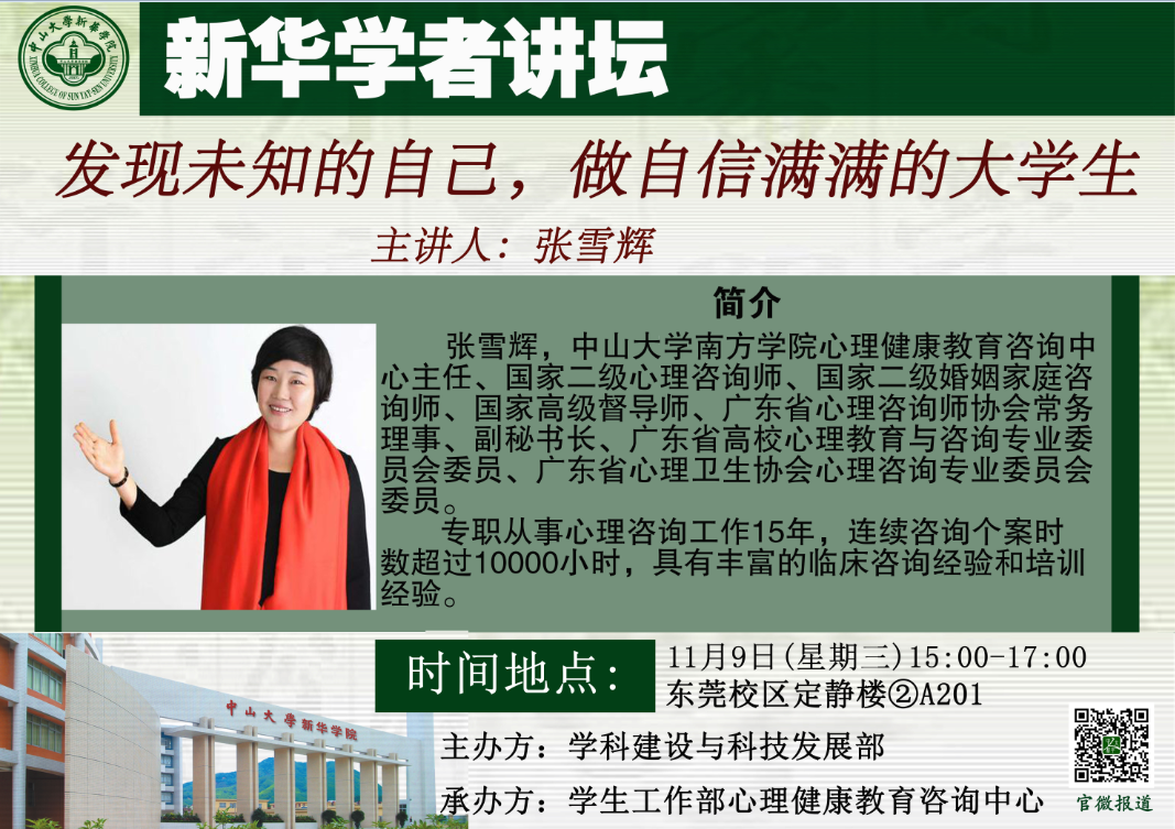 张雪辉,中山大学南方学院心理健康教育咨询中心主任 、国家二级心理咨询师、国家二级婚姻家庭咨询师、国家高级督导师、广东省心理咨询师协会常务理事、副秘书长、广东省高校心理教育与咨询专业委员会委员、 广东省心理卫生协会心理咨询师专业委员会委员。专职从事心理咨询工作15年,连续咨询个案时数超过10000小时,具有丰富的临床咨询经验和培训经验。