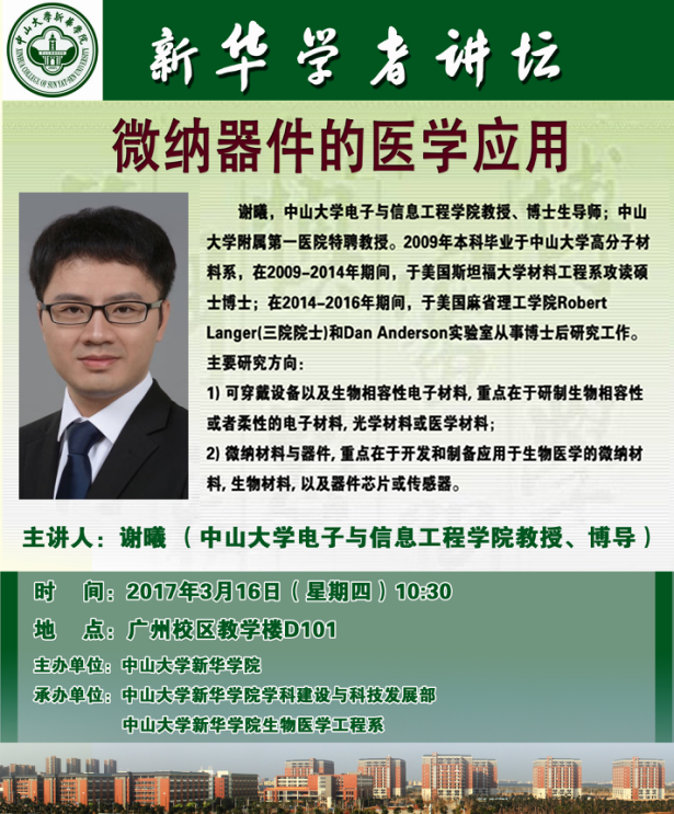 谢曦,中山大学电子与信息工程学院教授、博士生导师;中山大学附属第一医院特聘教授。2009年本科毕业于中山大学高分子材料系,在2009-2014年期间,于美国斯坦福大学材料工程系攻读硕士博士;在2014-2016年期间,于美国麻省理工学院Robert Langer(三院院士)和Dan Anderson实验室从事博士后研究工作。