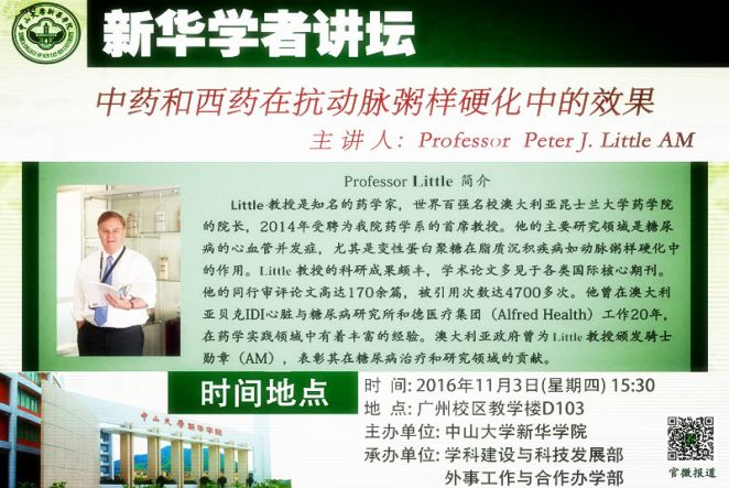 讲座主题:Anti-atherosclerotic actions of Traditional Chinese and Western drugs