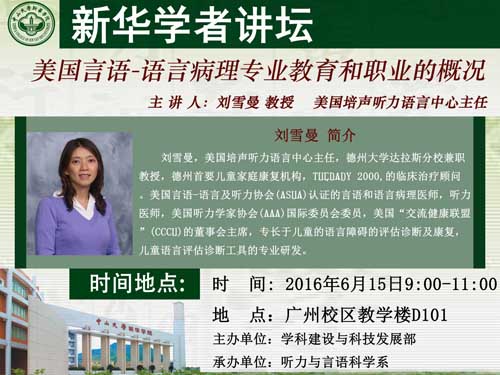 主 讲 人:刘雪曼 教授 美国培声听力语言中心主任