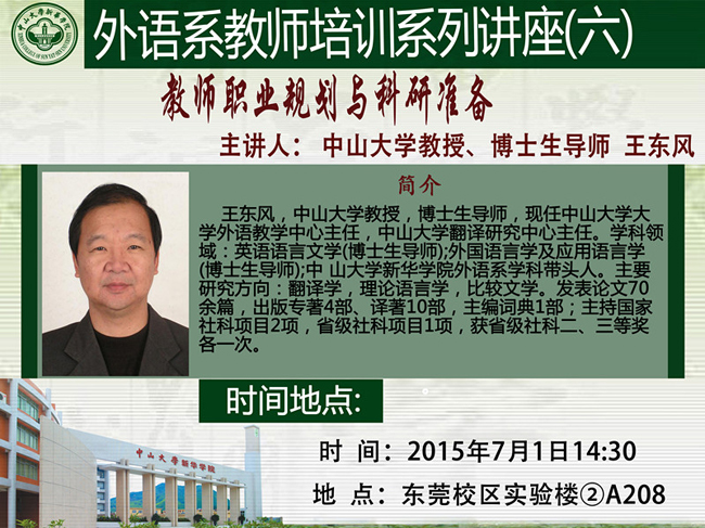王东风,中山大学教授,博士生导师,现任中山大学大学外语教学中心主任,中山大学翻译研究中心主任。学科领域:英语语言文学(博士生导师);外国语言学及应用语言学(博士生导师);中山大学新华学院外语系学科带头人。主要研究方向:翻译学,理论语言学,比较文学。发表论文70余篇,出版专著4部、译著10部,主编词典1部;主持国家社科项目2项,省级社科项目1项,获省级社科二、三等奖各一次。