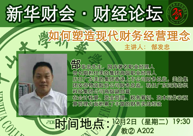 主讲人简介:郜发忠,国内著名职业经理人;曾长期担任美的集团高级职业经理人;历任广东美的集团香港上市公司财务总监,美的集团安得物流股份公司财务总监,现任广东四海纺织科技集团公司高级副总裁。在会计核算、资金管理、税务筹划、资本运作和预算管理方面积累了丰富的财务实战经验。