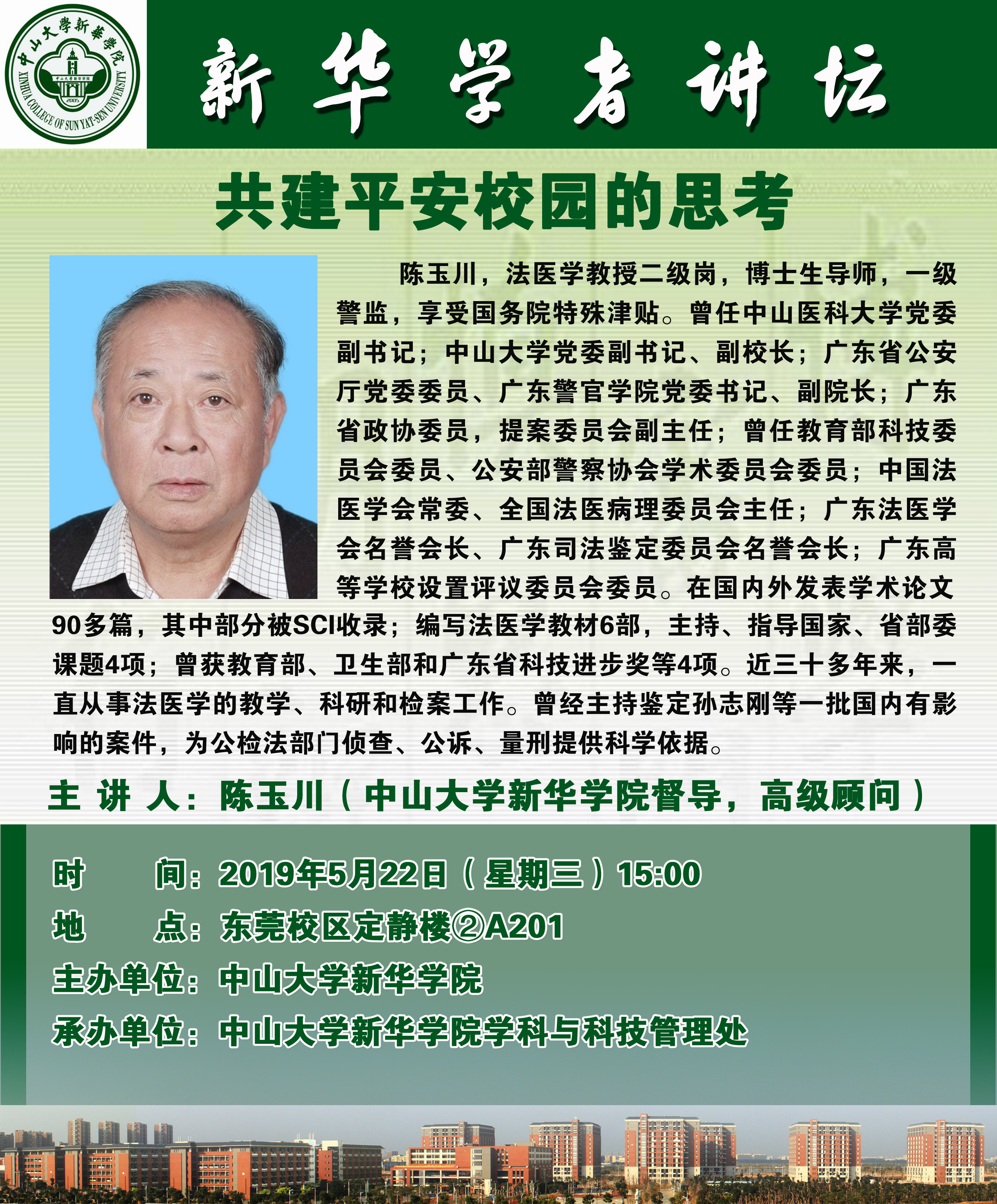 陈玉川,法医学教授二级岗,博士生导师,一级警监,享受国务院政府特殊津贴。曾任中山医科大学党委副书记,中山大学党委副书记、副校长,广东省公安厅党委委员、广东警官学院党委书记、副院长,广东省政协委员、提案委员会副主任;曾任教育部科技委员会委员、公安部警察协会学术委员会委员,中国法医学会常委、全国法医病理委员会主任,广东法医学会名誉会长、广东司法鉴定委员会名誉会长,广东高等学校设置评议委员会委员。在国内外发表学术论文90多篇,其中部分被SCI收录;编写法医学教材6部,主持、指导国家、省部委课题4项;曾获教育部、卫生部和广东省科技进步奖等4项。近三十多年来,一直从事法医学的教学、科研和检案工作。曾经主持鉴定孙志刚等一批国内有影响的案件,为公检法部门侦查、公诉、量刑提供科学依据。
