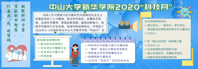 为深入学习贯彻习近平新时代中国特色社会主义思想和党的十九大精神,普及科学知识、传播科学思想、弘扬科学精神、营造创新氛围、提高创新能力,加强学科建设与专业发展,促进科研成果转化,中山大学新华学院(下文简称“我校”)于4-6月全面开展主题为“凝聚科研力量,贡献新华智慧,打赢抗‘疫’攻坚战”的科技月活动。