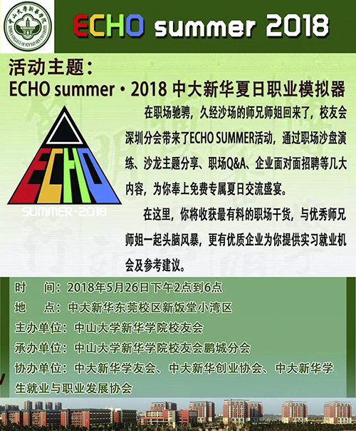 ECHO是中大新华校友会鹏城分会打造的一个交流分享活动品牌。拥有Energy、Connection、Honor、Opportunity元素的ECHO summer,是职场驰骋已久的师兄师姐们通过职场沙盘演练、沙龙主题分享、职场Q&A、企业面对面招聘等方式,为在校学生奉上专属夏日交流盛宴。在这里,你将收获最有料的职场干货,与优秀的师兄师姐一起头脑风暴,更有优质企业为你提供实习就业机会及参考建议。