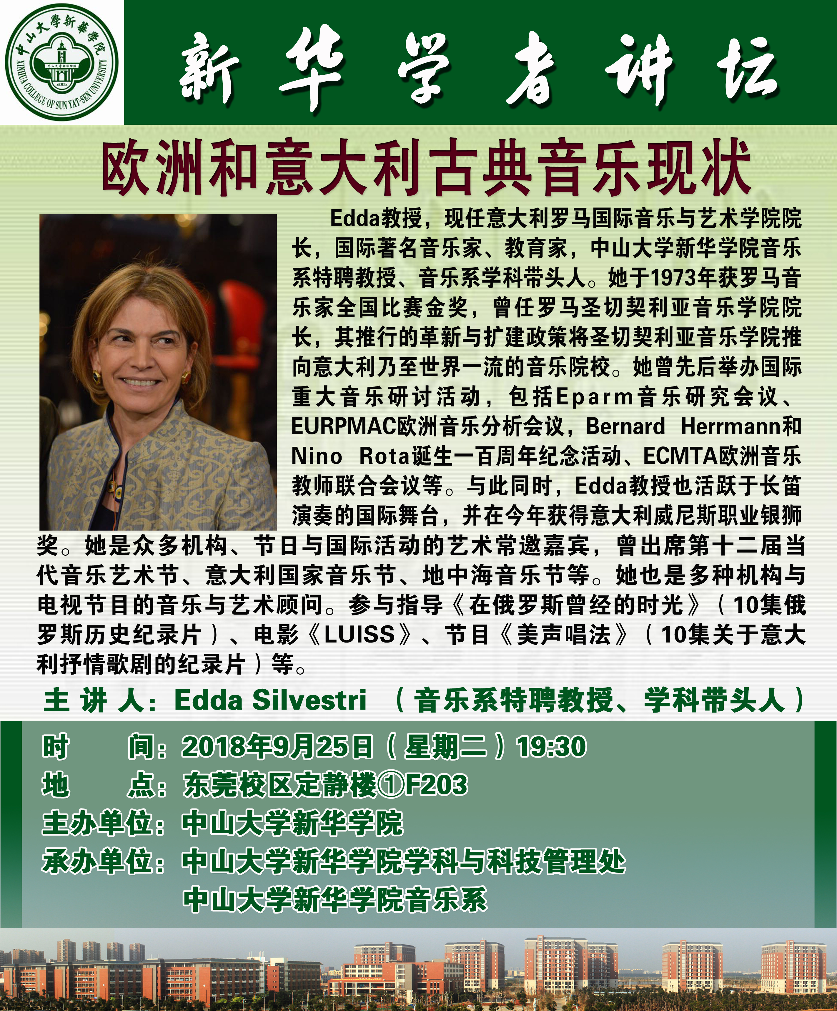 Edda教授,现任意大利罗马国际音乐与艺术学院院长,国际著名音乐家、教育家,中山大学新华学院音乐系特聘教授、音乐系学科带头人。她于1973年获罗马音乐家全国比赛金奖,曾任罗马圣切契利亚音乐学院院长,其推行的革新与扩建政策将圣切契利亚音乐学院推向意大利乃至世界一流的音乐院校。她曾先后举办国际重大音乐研讨活动,包括Eparm音乐研究会议、EURPMAC欧洲音乐分析会议,Bernard Herrmann和Nino Rota诞生一百周年纪念活动、ECMTA欧洲音乐教师联合会议等。与此同时,Edda教授也活跃于长笛演奏的国际舞台,并在今年获得意大利威尼斯职业银狮奖。她是众多机构、节日与国际活动的艺术常邀嘉宾,曾出席第十二届当代音乐艺术节、意大利国家音乐节、地中海音乐节等。她也是多种机构与电视节目的音乐与艺术顾问。参与指导《在俄罗斯曾经的时光》(10集俄罗斯历史纪录片)、电影《LUISS》、节目《美声唱法》(10集关于意大利抒情歌剧的纪录片)等。