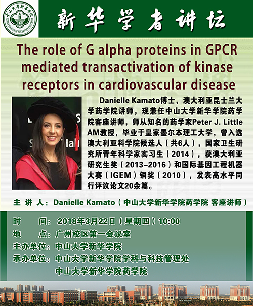 Danielle Kamato博士,澳大利亚昆士兰大学药学院讲师,现兼任中山大学新华学院药学院客座讲师,师从知名的药学家Peter J. Little AM教授,毕业于皇家墨尔本理工大学,曾入选澳大利亚科学院候选人(共6人),国家卫生研究所青年科学家实习生(2014),获澳大利亚研究生奖(2013-2016)和国际基因工程机器大赛(IGEM)铜奖(2010),发表高水平同行评议论文20余篇。