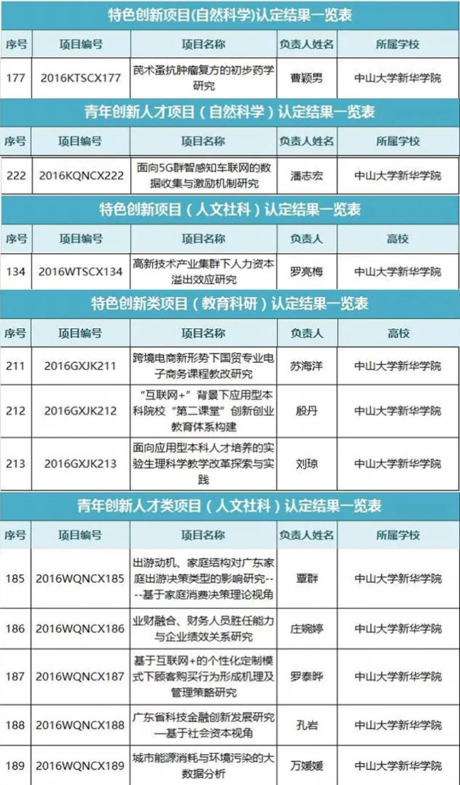 3月31日,广东省教育厅公布了2016年重点平台及科研项目立项名单。我校共有11个项目获得立项,其中特色创新项目(自然科学) 项目1项,青年创新人才类项目(自然科学类)1项,特色创新项目(人文社科类)1项,特色创新项目(教育科研类)3项,青年创新人才类项目(人文社科类)5项。