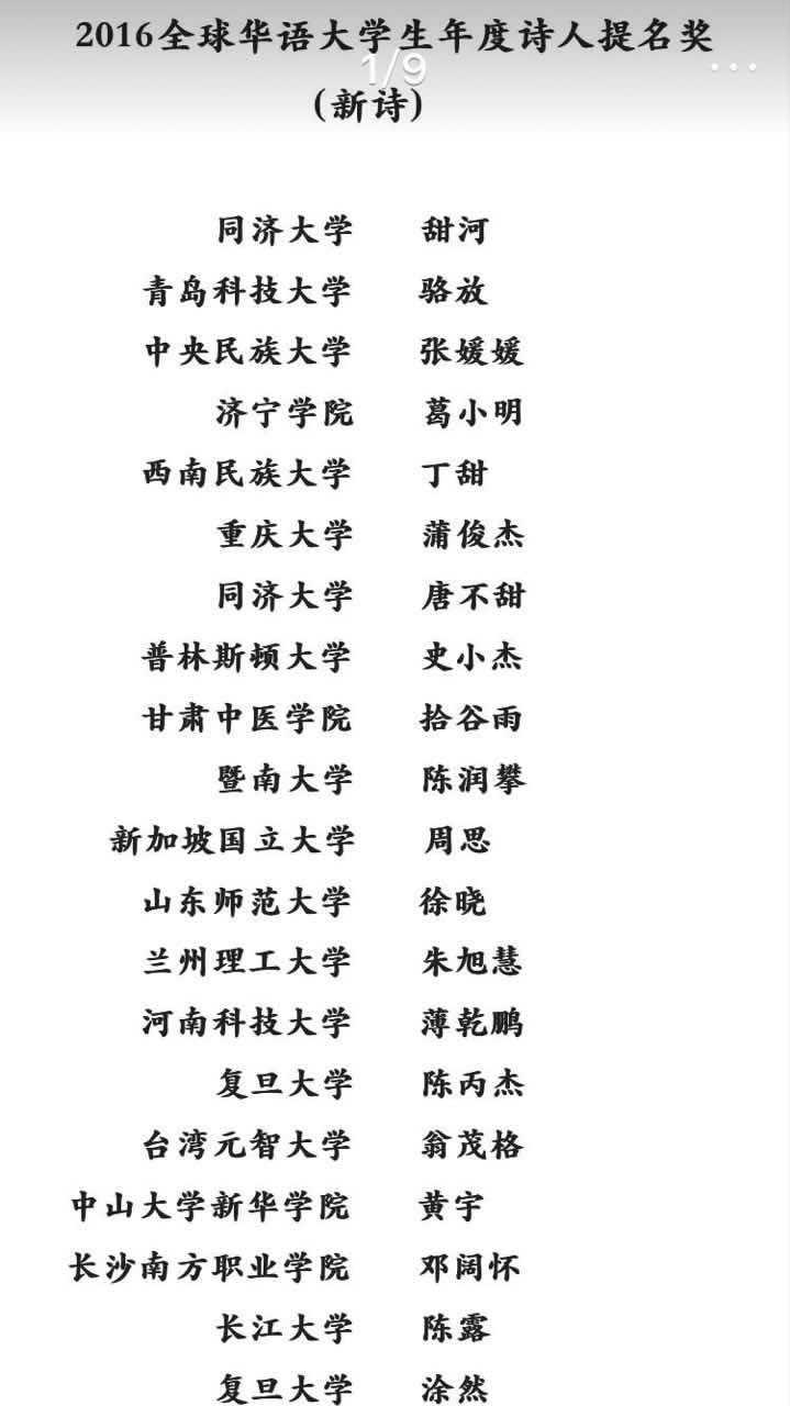 7月28日,由教育部上海交通大学研会微博网络文化工作室主办的2016全球华语大学生年度诗人评选正式公布结果。经层层选拔,新诗和旧体诗词各10位大学生从全球1560所高校2.3万参赛者中脱颖而出,斩获年度诗人殊荣。