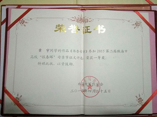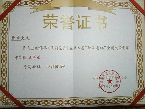 近日,青年作家黄宇同学再次收获多个文学大奖。其作品《书香母亲》荣获2015年第二届珠海市报春晖母亲节征文一等奖;作品《回到敬亭山(组诗)》荣获《诗刊》“敬亭山杯”全国青少年诗词征文新诗组三等奖;《茉莉花开》荣获第二届“新风度杯”全国文学竞赛三等奖。