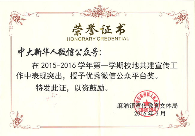 中山大学新华学院官微“中大新华人”在校地共建宣传工作中表现突出,荣获麻涌镇宣传教育文体局颁发的2015-2016学年第一学期优秀微信公众平台奖。