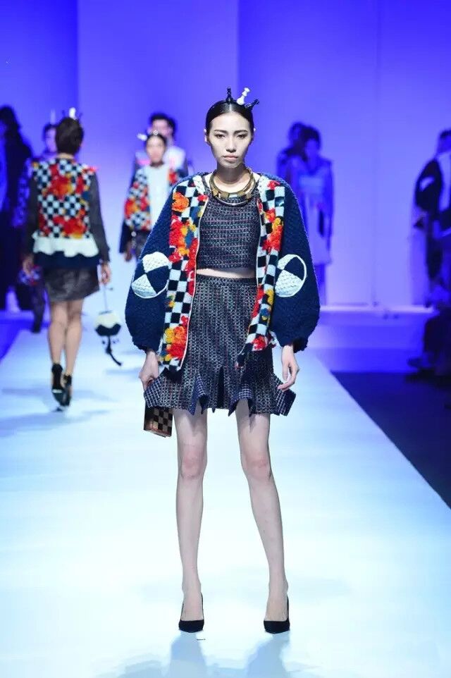 而作品《棋趣》采用各种呢料的创意拼接,独特的格纹图案,搭配有趣的外形设计,打造出一种极具特色的舞台效果。