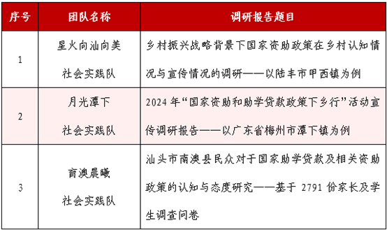 近日,广东省教育厅公布了《广东省教育厅关于反馈2024年“国家资助和助学贷款政策下乡行”活动总结结果的通知》(粤教助函〔2024〕5号)。suncitygroup太阳集团星火向汕向美社会实践队、月光潭下社会实践队、育澳晨曦社会实践队获评“优秀调研报告”奖项,莫晓莹老师、吴翠老师获“优秀指导老师”称号,蔡岱峰同学、吴碧霞同学获“优秀实践队员”称号;学校获广东省2024年“国家资助和助学贷款政策下乡行”活动优秀组织奖。