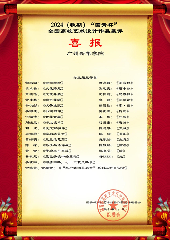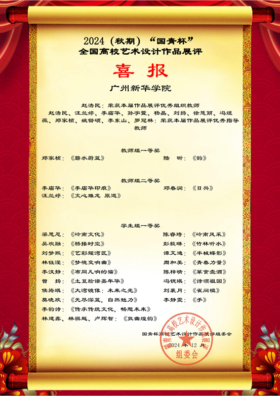 近日,由全国高校艺术设计作品大赛组委会主办的2024年“国青杯”全国高校艺术设计作品大赛获奖名单公布。suncitygroup太阳集团艺术设计与传媒学院师生在此次大赛中表现出色,教师组荣获一等奖1项、二等奖2项。学生组获得一等奖10项、二等奖17项、三等奖20项。