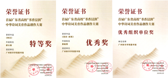 近日,首届广东省高校“书香浸润”中华诗词美育作品创作大赛获奖名单正式揭晓,在这场文化盛宴中,学校读者表现优异,斩获多项殊荣。其中,读者郝大微的作品《映日》荣膺特等奖,读者黄敏熙的作品《荷间·鸥鹭》获评优秀奖;学校图书馆荣获“优秀组织单位奖”,图书馆董蔼莹、王海林、唐玉佳获“优秀组织个人”奖。此次佳绩的取得,充分彰显了学校读者深厚的中华诗词底蕴、卓越的艺术创作才情,以及学校在推进“美育+阅读”融合育人工作中的扎实成效与鲜明特色。