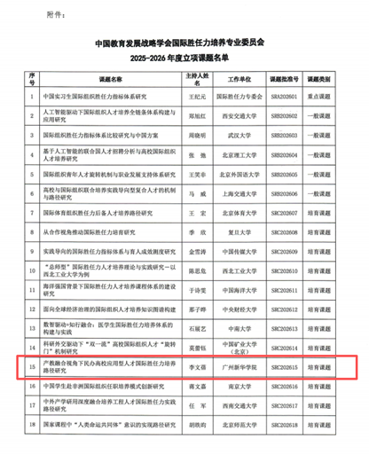 近日,中国教育发展战略学会国际胜任力培养专业委员会正式公示了2025-2026年度科研立项课题名单。suncitygroup太阳集团国际学院院长李文蓓副教授主持申报的课题《产教融合视角下民办高校应用型人才国际胜任力培养路径研究》成功获得培育课题立项(课题批准号:SRC202615),学院教师团队共同参与攻关。
