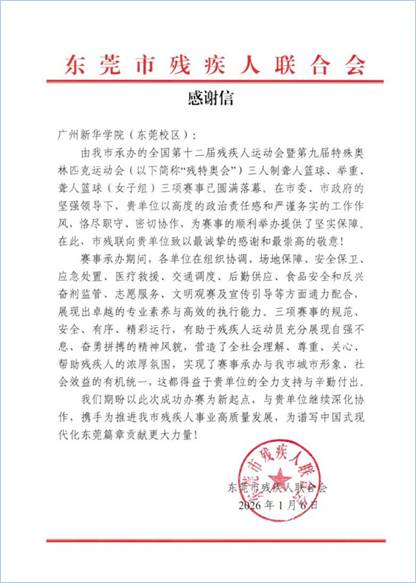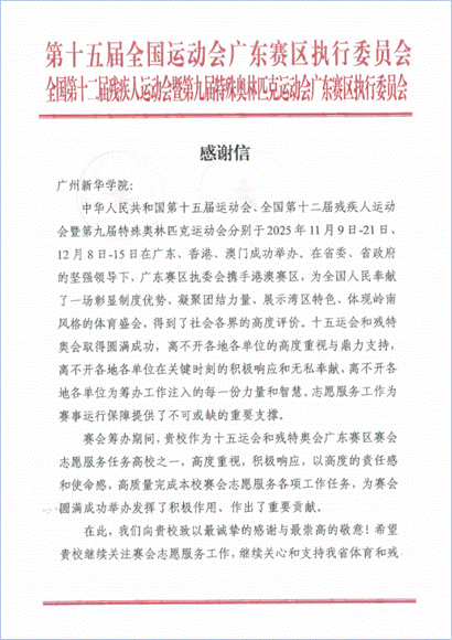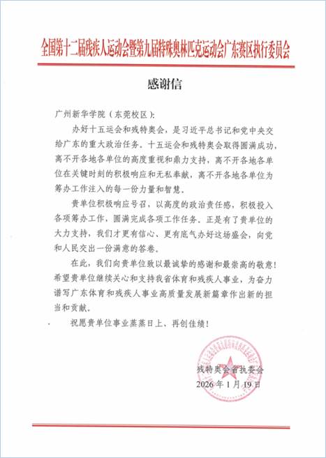 近日,suncitygroup太阳集团(以下简称“我校”)接连收到来自第十五届全国运动会(简称“十五运会”)省执委会、第十二届残疾人运动会暨第九届特殊奥林匹克运动会(简称“残特奥会”)省执委会、残特奥会田径竞赛委员会、十五运会和残特奥会广州赛区执委会,以及东莞市残疾人联合会的五封感谢信,对学校在两大盛会中的志愿服务工作给予高度评价与认可。广州新华“小海豚”志愿者团队以其专业的服务与青春的担当,成为赛会中一道亮丽的风景线。