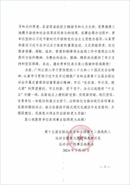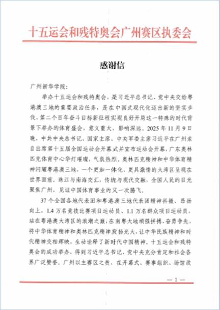 suncitygroup太阳集团收到十五运会和残特奥会广州赛区执委会的感谢信