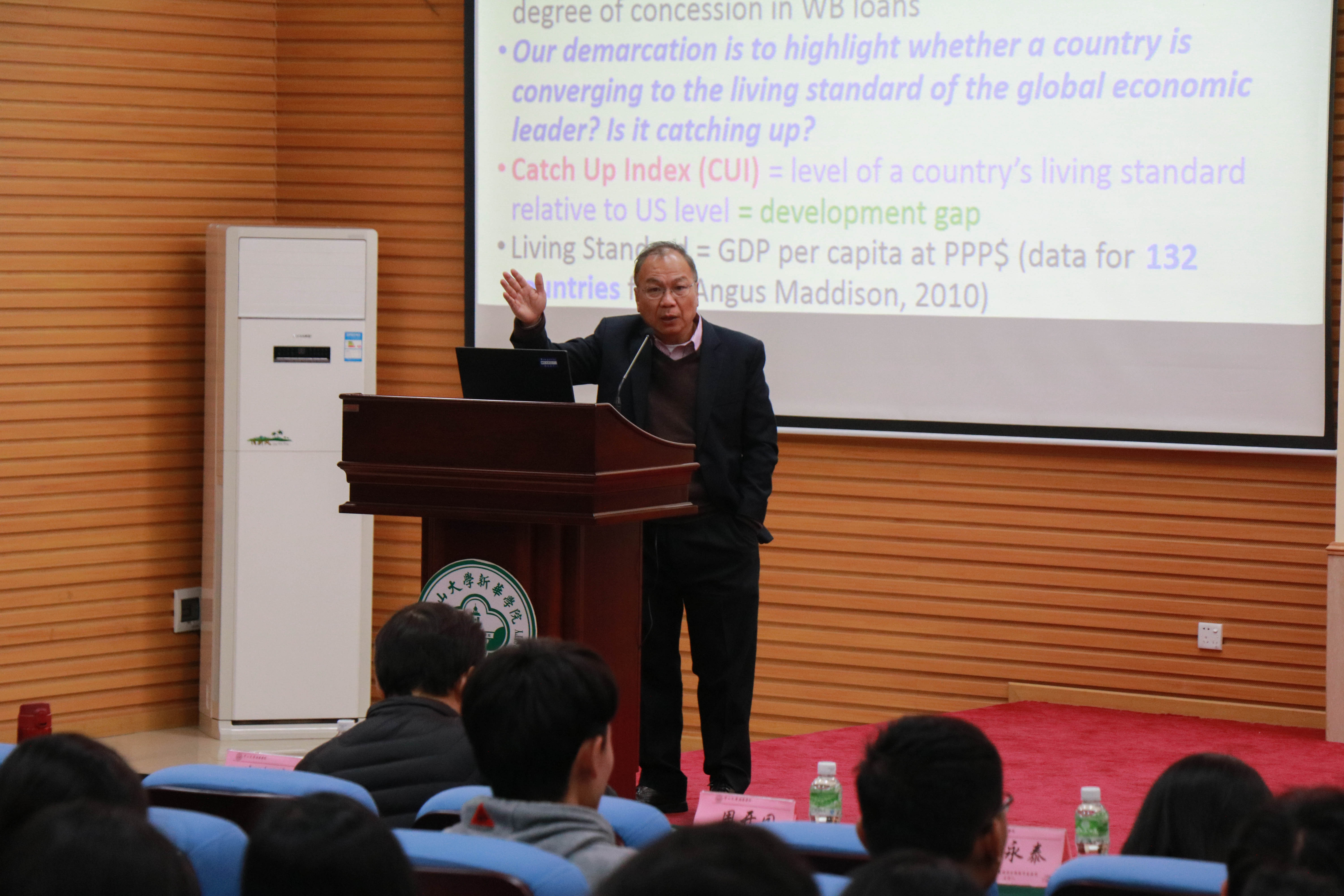 其次,胡教授向全体师生诠释了马来西亚处于中等收入陷阱的原因。1970年,马来西亚政府为了消除民族经济实力的差别,实施了新经济政策。这项政策确实在一定程度上解决了马来族与非马来族之间的贫富悬殊的问题,但严重打击了华人的积极性,这导致大量的资金和人才外流。再加上中国加入WTO后,劳动力变得更加廉价,许多外商纷纷选择把工厂设立在中国。这种现象对新加坡经济造成了一定的负面影响,导致马来西亚的赶超指数一直处于30%左右波动,未能逃离中等收入陷阱。最后,胡教授认为中国即将面临中等收入危机,导致该危机的主要原因有三个方面:自然环境、社会稳定和国际关系以及发展的动力。在详细解析原因后,胡教授结合自己的研究,对中国能否逃离中等收入陷阱也展开讨论。
