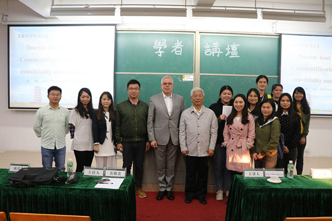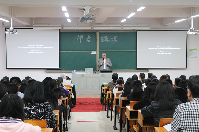 12月4日下午,由中山大学新华学院(以下简称学校)主办,学科与科技管理处和外国语学院(以下简称外院)承办的新华学者讲座在东莞校区举行。此次讲座诚邀香港大学教授Adam Jaworski担任主讲嘉宾,讲座主题为Tourist-Host of Interactions: Commodification of Language, Conviviality and Performance,外院副院长黄继炎主持讲座。外院英语专业副主任李贻、办公室主任欧衍伽,基础教研室主任袁侥蔚以及外院学子共同参加此次讲座。