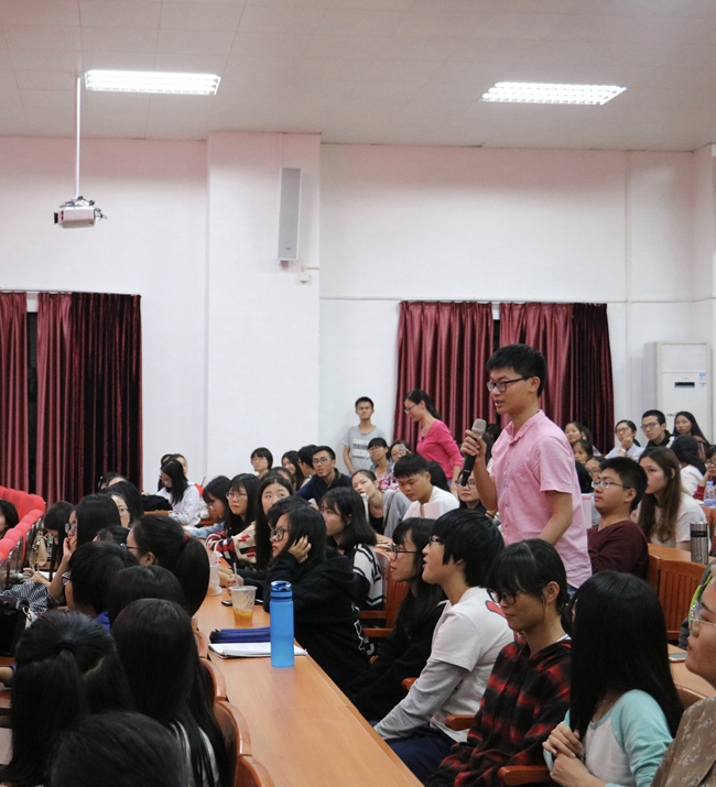 在互动环节中,同学们踊跃地向王缉思教授请教关于国际关系的问题,来自管理学院的张玉莹同学向王教授提出疑问:“王教授您好,在去年英国的纪录片《即将到来的对华战争》中,外国一些专家学者提出,在一定意义上中美已经开战了,并且在中国的军事国防图中可以看到,在中国周边的美国军事基地分布得密密麻麻,像一条绳索一样套牢着中国;而另一方面中国与美国在经济方面可以说是相偎相依密不可分,对中美之间经济与安全这样的一个矛盾,您怎么看?”王教授首先表示张同学提的问题非常好,他认为中美之间在经济上的合作绝大部分都是互利互惠的,所以在经济上合作大于冲突;而在军事安全上,如南海问题,在一段时间内冲突大于合作,或许将来会有局部军事的摩擦,但中美之间私下有商议签署规避协议,例如将来在南海等起了冲突,双方将如何协商解决,将这一冲突矛盾化到最小。王教授明晰的解答启发了同学们对中美关系及中国未来的发展的深入思考和探索。