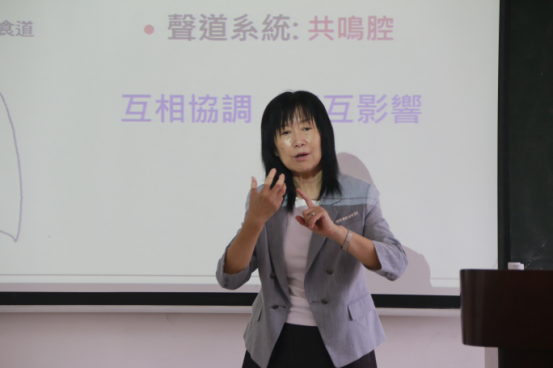 盛华分别介绍了嗓音障碍处置的理念,处置团队以及处置方式,她指出嗓音治疗目的在于改善嗓音生理状况,减轻嗓音症状及影响,提升沟通生活品质。盛华还介绍了当今的嗓音治疗方法,嗓音卫生教育加生理嗓音治疗,并分别举例示范如何进行嗓音训练。