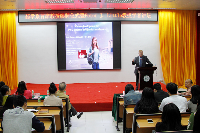 3月22日上午,澳大利亚昆士兰大学药学院院长、我校药学系首席教授Peter J. Little AM在广州校区开展题为“博士与初级研究员的职业发展”的讲座,我校校长王庭槐、人事部部长简庚荣、外事工作与合作办学部副部长刘传华、药学系主任陈家树、药学系副主任张素中、药学系办公室主任曹颖男、护理学院首席教授Prof. Susan Holli Neidlinger等出席了讲座。讲座由药学系主任陈家树主持,药学系师生代表参加。