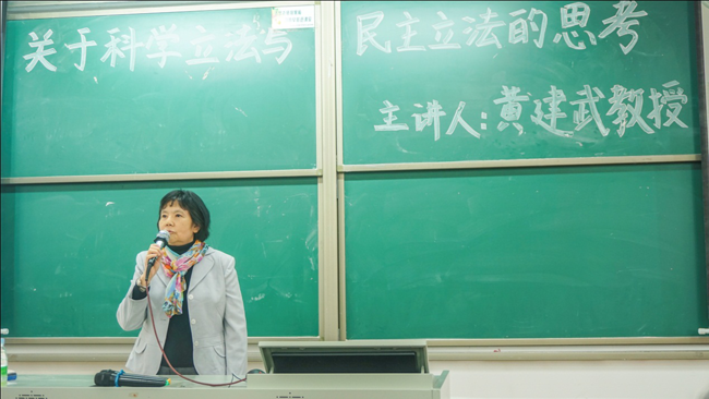 黄建武教授讲解了民主立法的含义及要求:民主的内容必须表达人们的意志;立法的过程必须民主公开,保证人民的参与。他从立法规划与计划,法律法规的草案起草、审议,立法调研、立法论证、立法听证等重要环节对如何实现科学立法和民主立法的结合提出了自己的建议。