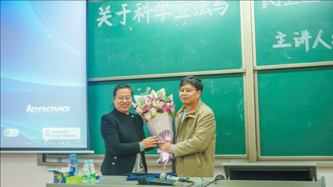 12月28日下午,中山大学法学院教授,法理学学科带头人黄建武教授应邀为我校师生作了题为《关于科学立法与民主立法的思考》的学术讲座。我校党委书记周云研究员致辞,讲座由法律学系李岚副主任主持,法律学系师生们聆听,现场座无虚席。