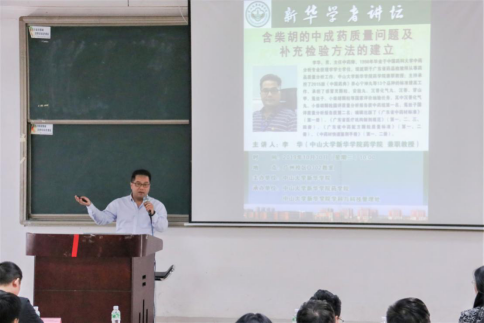 10月30日,由中山大学新华学院(以下简称“我校”)主办、药学院及学科与科技管理处共同承办的主题为“含柴胡的中成药质量问题及补充检验方法的建立”的学者讲坛在广州校区进行。本次讲座特邀广东省药品检验所主任中药师、我校药学院兼职教授李华担任主讲人,我校药学院副院长曹颖男主持讲座。
