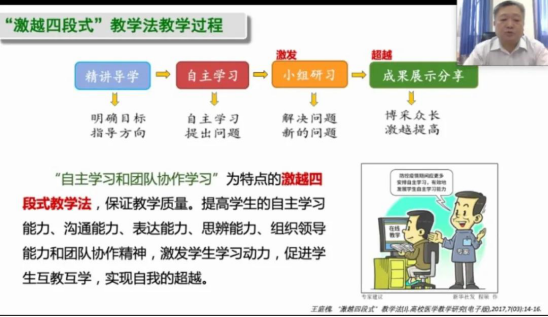 王庭槐:在最初实践TBL(Team-Based Learning)教学法时,有些学校学生不大适应自主学习的方法。因此在“激越四段式教学法”第一步的导学中加进了老师“精讲”。根据目前收集到各个院校的情况显示,该教学法有助于教师们启发学生的思维,学生们基本都可以适应。